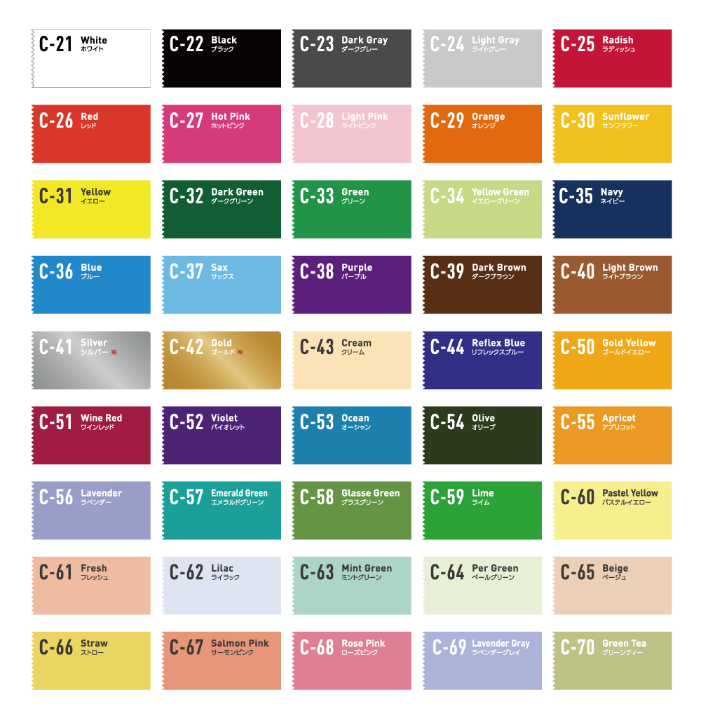 「プリントの色がわからない…」「どういう色があるの?」という方は、下記のカラー見本よりご指定が可能です。