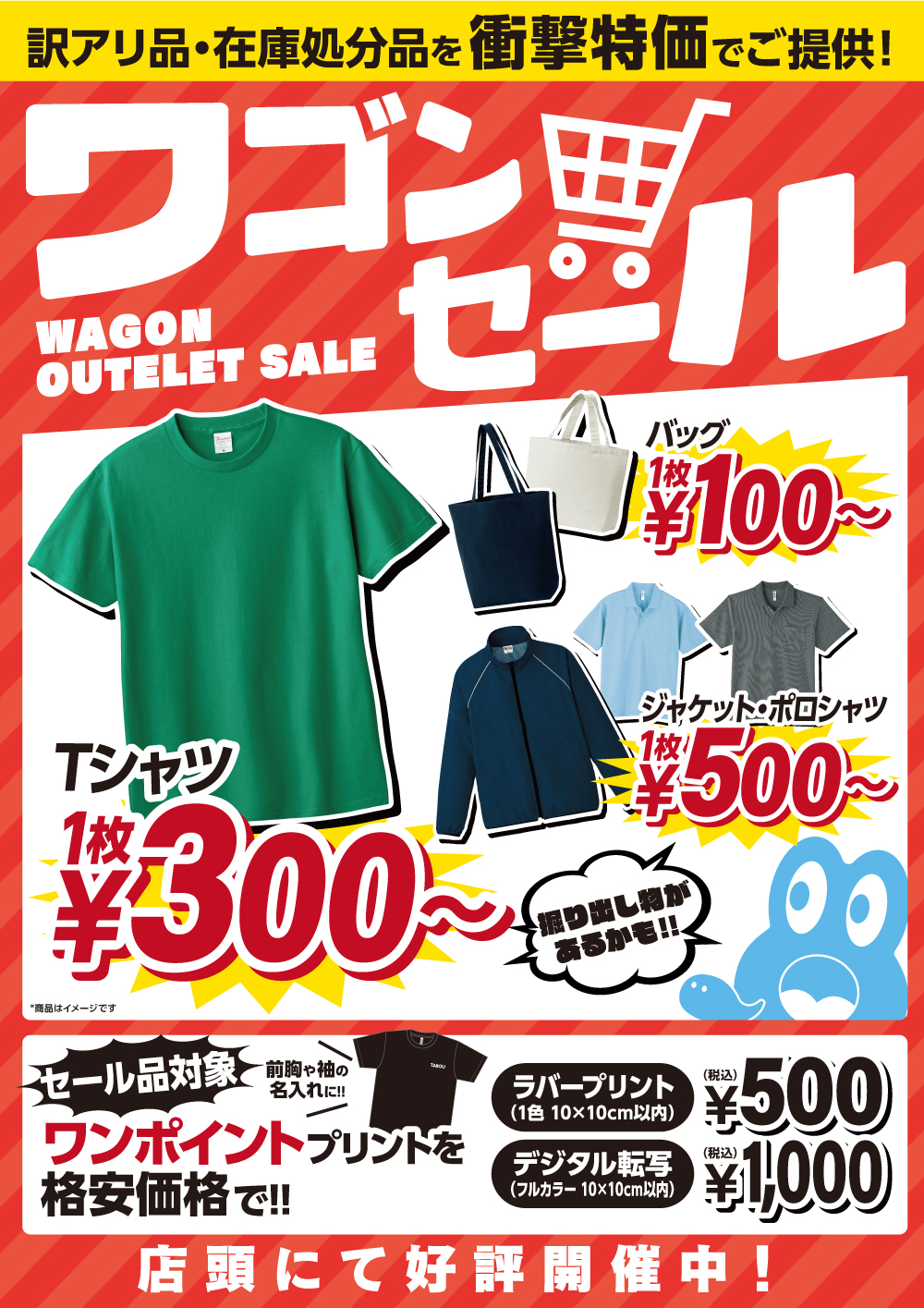 ケローズでは店頭にてワゴンセールを開催中!廃盤商品や訳ワリ品を大特価で販売! さらに!セール品に限り商品のワンポイントプリントを500円~できちゃいます!おためしでプリントをしてみたい方はぜひご利用ください。 ※セールの詳細につきましては、LINEまたは店舗スタッフにお問い合わせください。※取り扱い商品の色や品番・サイズなど詳細に関するご質問はお答えできかねます。