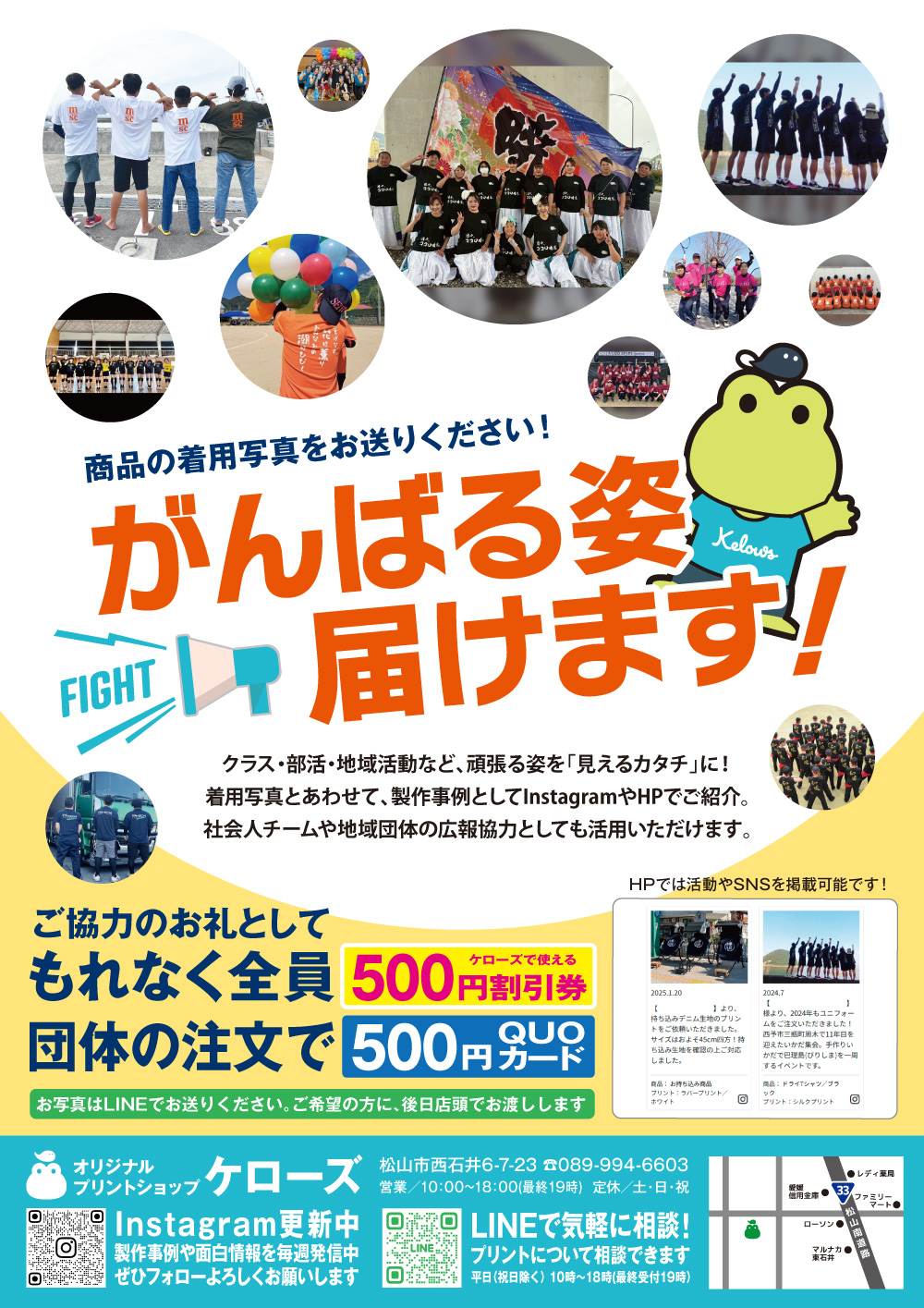 製作した商品の着用写真を送ると「500円割引券」や「QUOカード」などをプレゼントします!