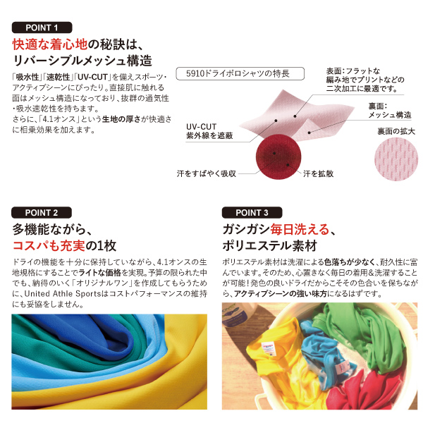 ドライアスレチックTシャツと同じ仕様の生地を使用した、動きやすいドライポロシャツ。